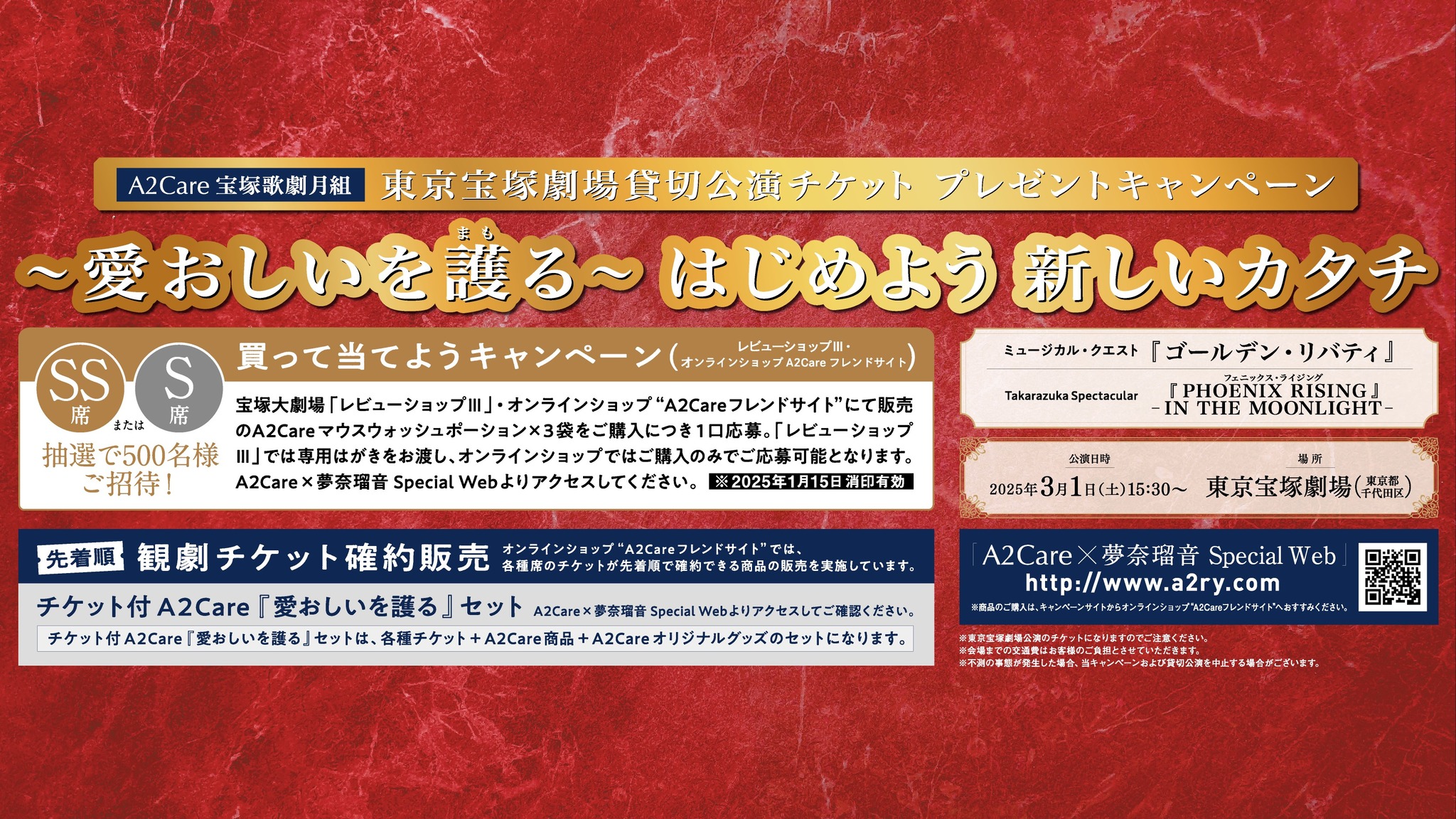 キャンペーンに関するお問い合わせ:A2Care 東京宝塚劇場 月組 貸切公演《愛おしいを護る》キャンペーン事務局