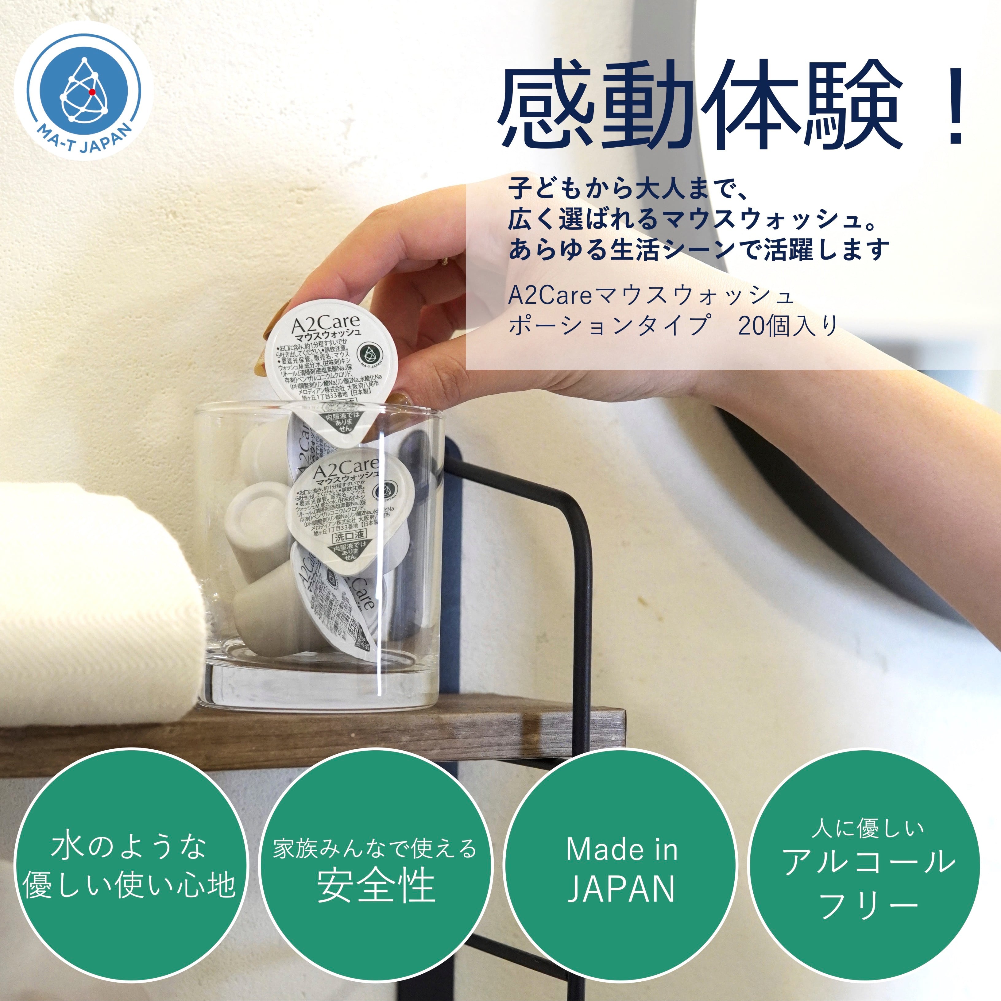 A2Careマウスウォッシュは、高い安全性を保ちながら優れた除菌消臭効果を両立させた A2Care(MA-T)から、主成分はそのままで、口腔ケア商品を開発しました。