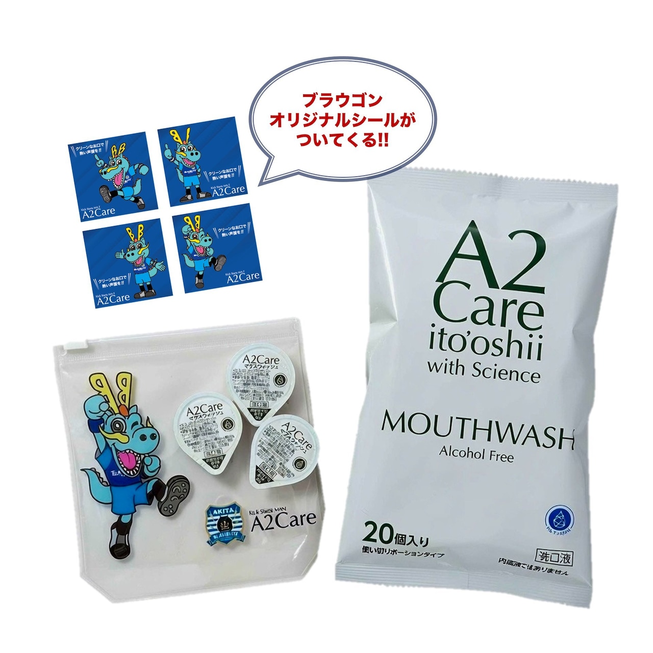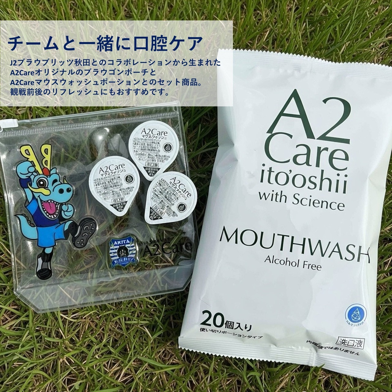 A2CareオリジナルのブラウゴンポーチとA2Careマウスウォッシュポーションとのセット販売です。