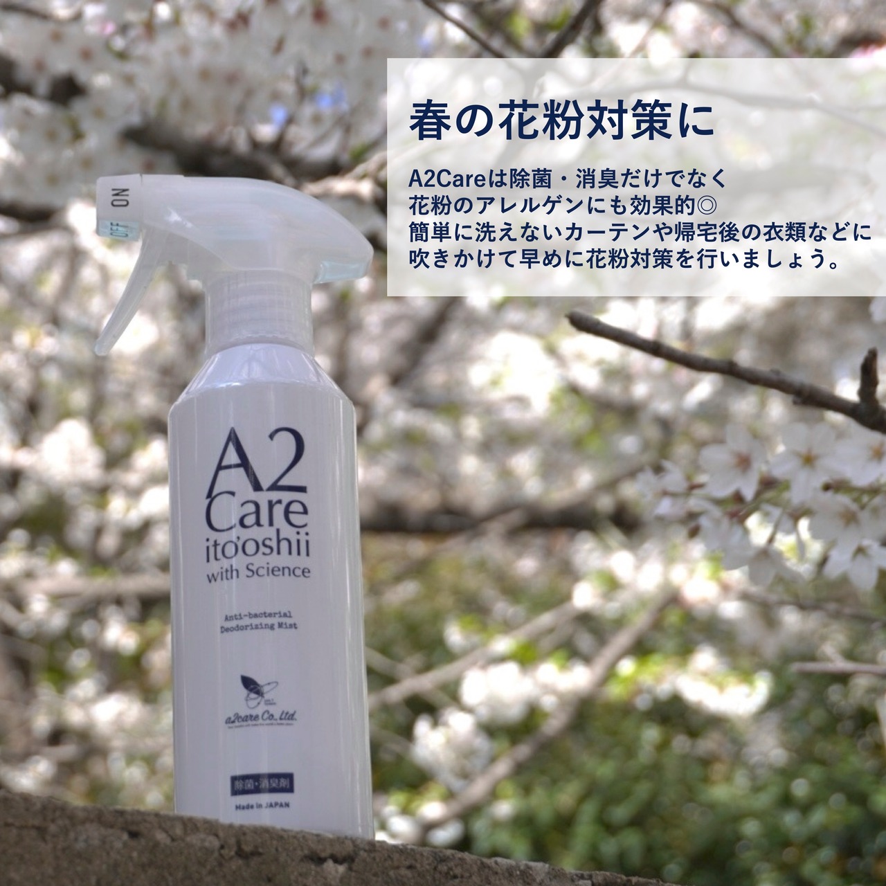 A2Careは、無色・無臭の水溶液で、アルコールフリーの主成分【MA-T SYSTEM®︎】が、細菌やウイルス・カビに働きかけ、除菌・カビ抑制効果を発揮します。