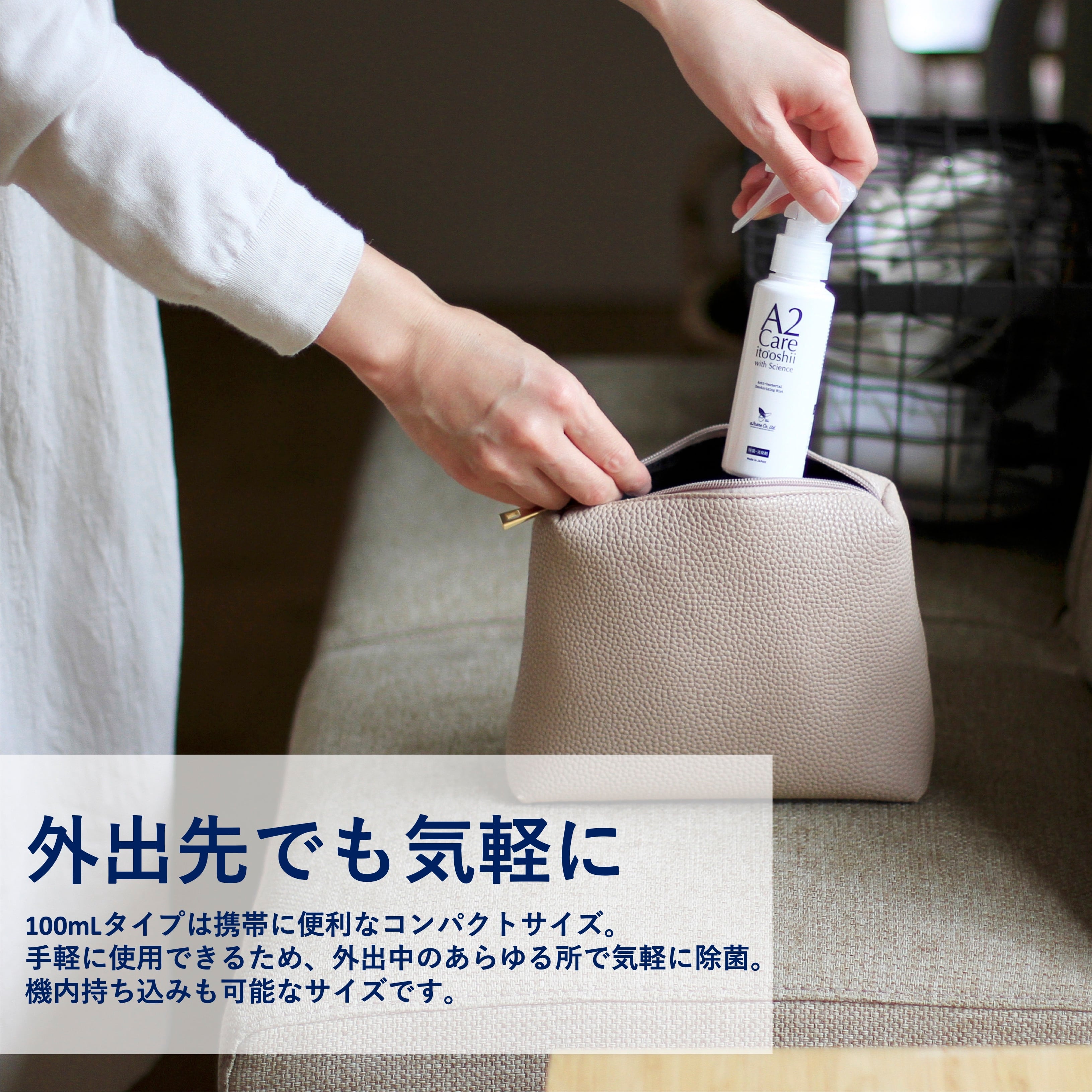 A2Careは、無色・無臭の水溶液で、アルコールフリーの主成分【MA-T SYSTEM®︎】が、細菌やウイルス・カビに働きかけ、除菌・カビ抑制効果を発揮します。